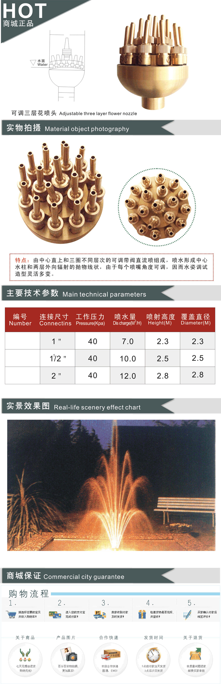 可调 三层花 喷头 1寸 - 2寸 全铜材料 水景 景观