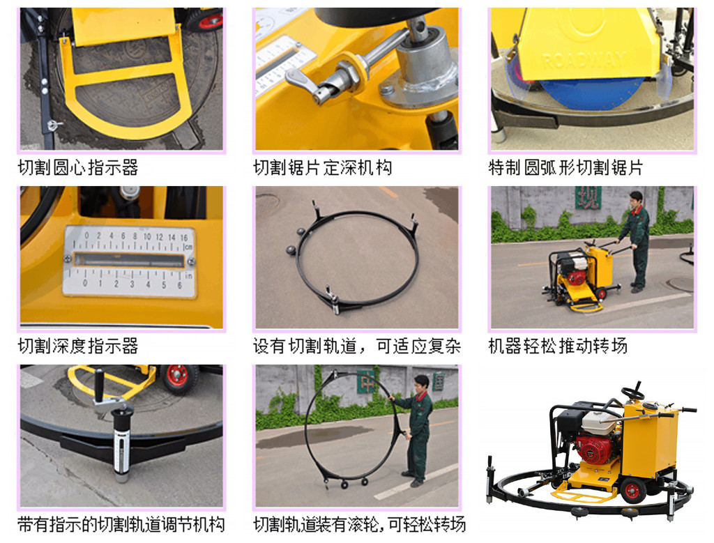 产品特点: ·使用普通的锯片在沥青、混凝土、石板等地面上进行全自动的圆周切割; ·使用圆周的切割方式,切割量比传统方形切割方式减少了40%,清除、回填量分别减少了50%;