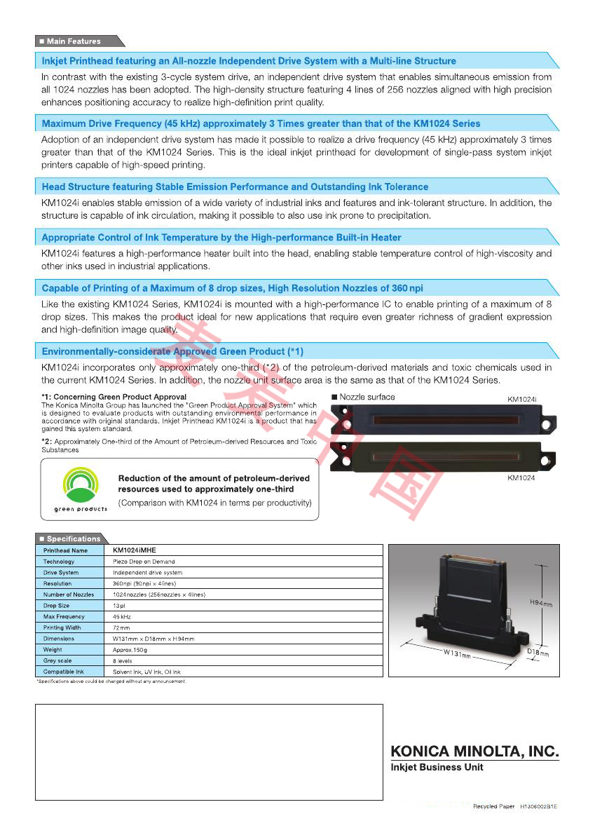 与现有的 KM1024 系列相比,本产品的石油资源使用量、有害化学物质削减为约三分之一(注2)。 而喷嘴的面积与之前的设计相同。