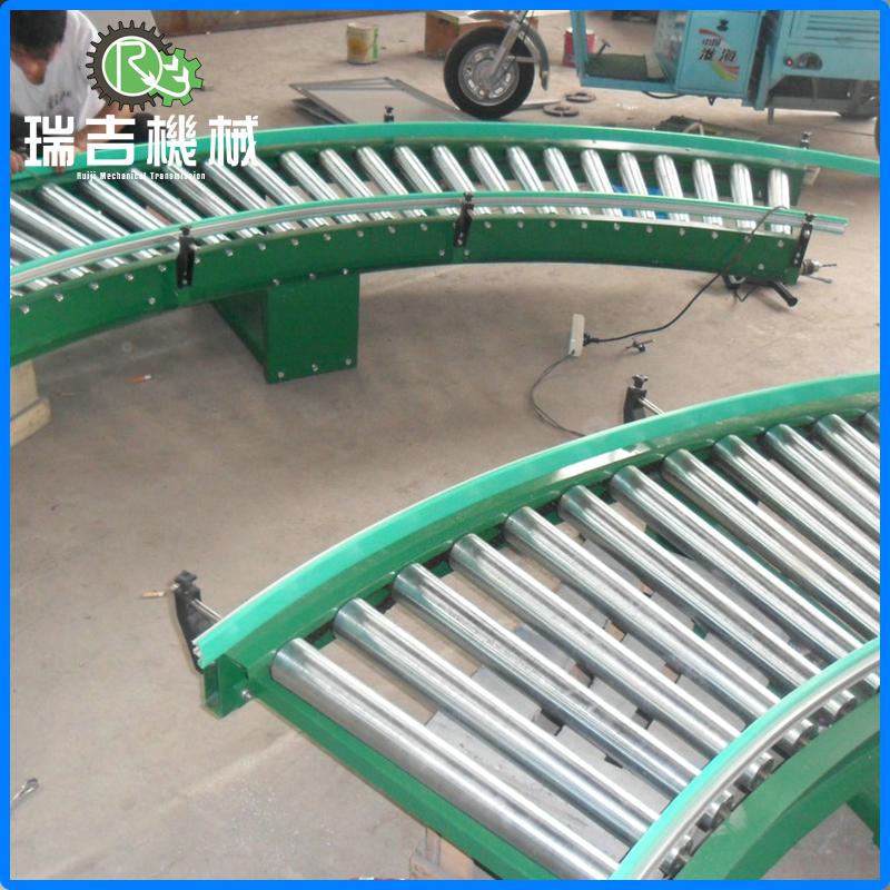 尺寸规格:滚筒输送机内宽度由客户指定,可按客户需求制作,转弯滚线标准转弯内半径为300、600、900、1200mm等,也可按客户需求采用其它特殊规格。直段滚筒所用的滚筒直径有38、50、60、76、89mm等。转弯滚筒的锥度我们会根据输送物体的重量、外形尺寸、线速度等来设计。