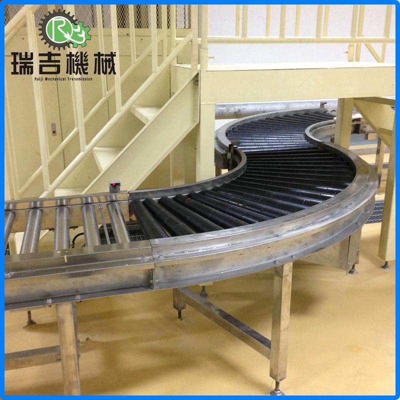 对于弯道机的锥形滚筒,其滚面宽度及锥度视货物尺寸和转弯半径而定。