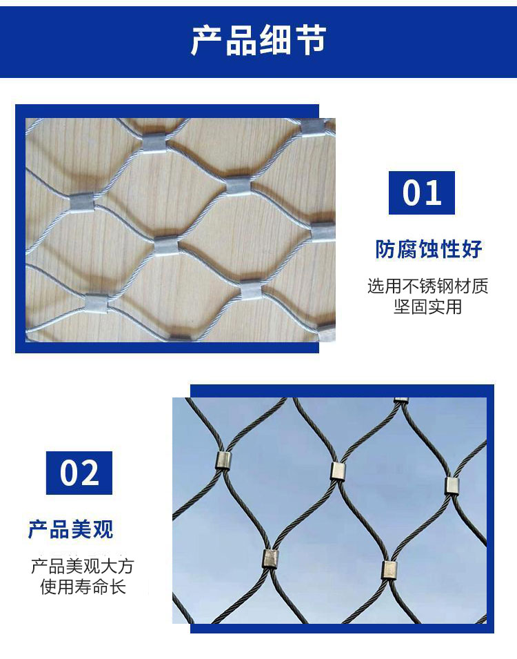 特点:不锈钢绳网的特点有:重量较轻、强度高、不容易腐蚀。柔软性好、耐冲击、破断力大、
