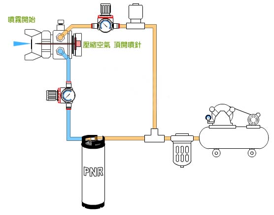 ST-5系列的自动喷头,其『活塞作动用空气』与『雾化用空气』乃是共用的,因此,压缩空气的压力必须高于活塞弹簧的簧力,否则,喷头将无法正常运作,ST-5系列的自动喷头适用在高雾化要求及喷头开关频率较低的工作环境。