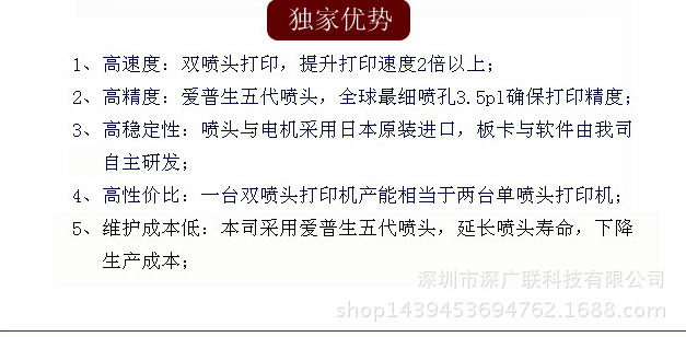 | 喷头型号 | 墨滴可控微压电式喷头(180喷嘴*8列)(五代/七代任选)喷头耐溶剂型双喷头 |