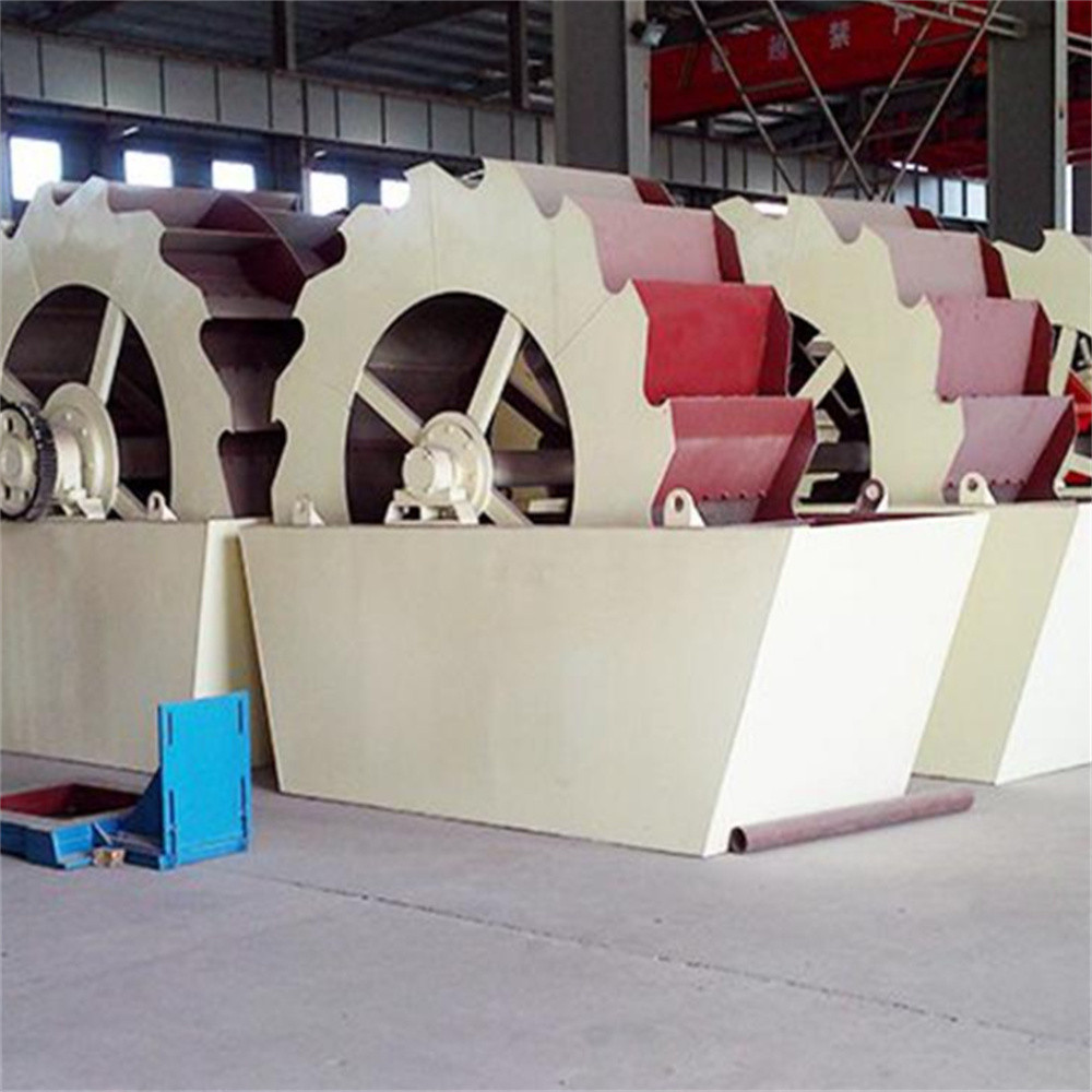 轮斗洗砂机工作时,动力装置通过三角带、减速机、齿轮减速后带动叶轮缓慢转动,砂石由给料槽进入洗槽中,在叶轮的带动下翻滚,并互相研磨,除去覆盖砂石表面的杂质,同时破坏包覆砂粒的水汽层,以利于脱水;同时加水,形成强大水流,及时将杂质及比重小的异物带走,并从溢出口洗槽排出,完成清洗过程。