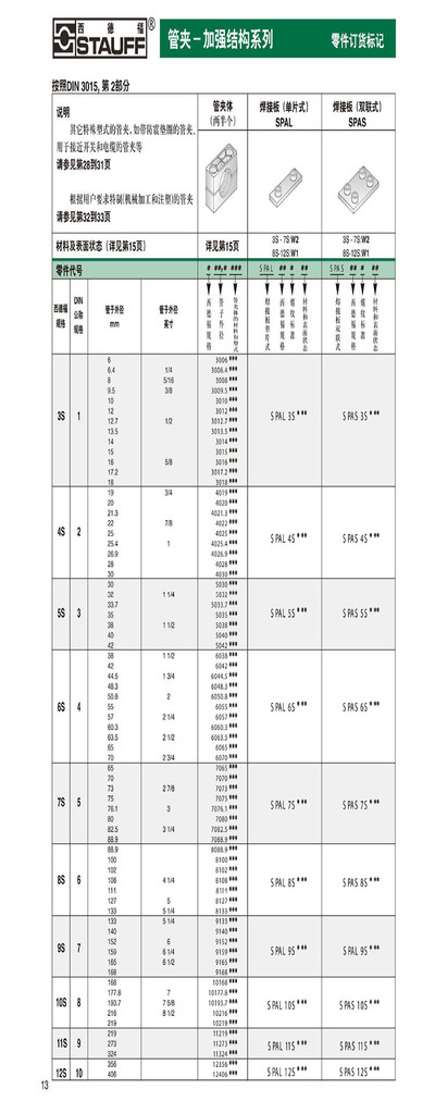 ** 西德福标准重型单孔塑料管夹 外六角重型塑料管夹 单孔加厚盖板塑料管夹管夹应用范围 轻型系列管夹应用于 6 种尺寸系列的普通机械压力管子,管子外径 6-57mm。 双联系列管夹应用于 5 种尺寸系列的机械压力管子,管子外径 6-42mm。 重型系列管夹应用于 8 种尺寸系列的高机械压力管子,管子外径 8-273mm。管夹材料特性 密度、弯曲强度、冲击韧性、压缩强度、弹性模量、拉伸强度、耐温、** 西德福标准重型单孔塑料管夹 外六角重型塑料管夹 单孔加厚盖板塑料管夹颜色管夹安装程序 装配在焊接板上 装配前,为知道管夹夹的方向,建议先在固定处做好标记,后焊上焊接,嵌上管夹身的下半部分,放上需固定的管子。再放上另一半管夹身和盖板,用螺钉拧紧。 切忌直接焊接已装好管夹的底板。 装地导轨上 ,导轨可焊在基础上,或用螺钉固定** 西德福标准重型单孔塑料管夹 外六角重型塑料管夹 单孔加厚盖板塑料管夹随后将导轨螺母推入轨内,并转 90 度,将下半个管夹身嵌入螺母,放上需固定的管子,再放上上半个管管夹身和盖板,用螺钉固定。 叠起装配,导轨可焊在基础上,或用螺钉固定,先装上下半个管夹身,放上需固定的管子再放上上半个管夹身** 西德福标准重型单孔塑料管夹 外六角重型塑料管夹 单孔加厚盖板塑料管夹,用螺钉固定。
