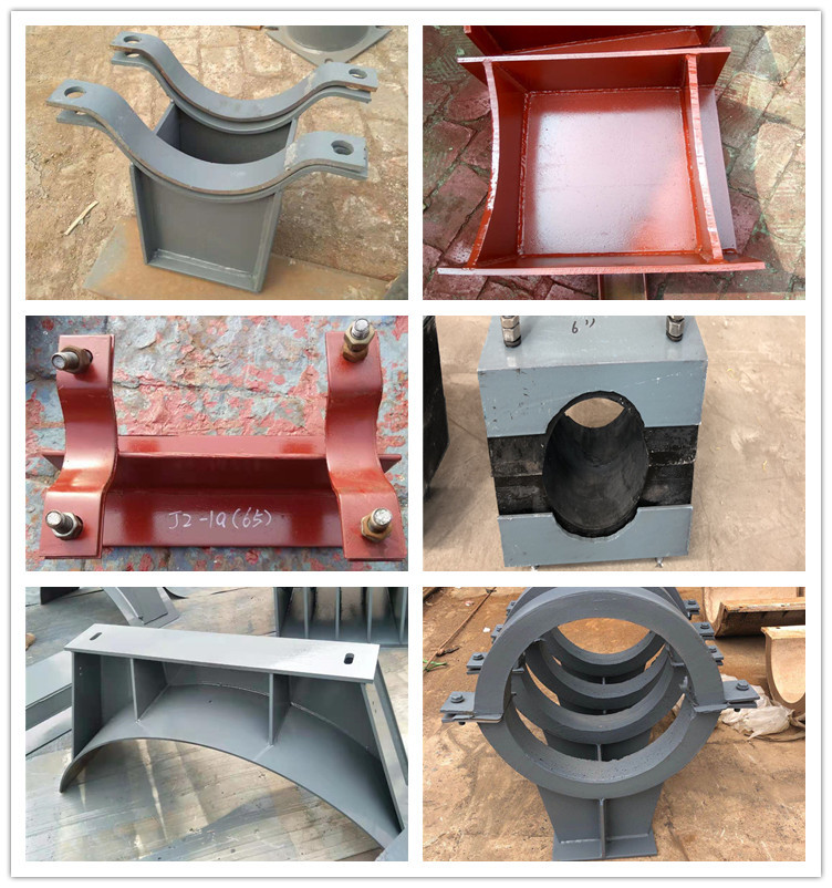 根据联接方式不同,每类管夹有带底板和不带底板两种,前者管夹用螺栓与底板联接,底板焊在支架和机体上,后者管夹用螺栓与支架直接联接。