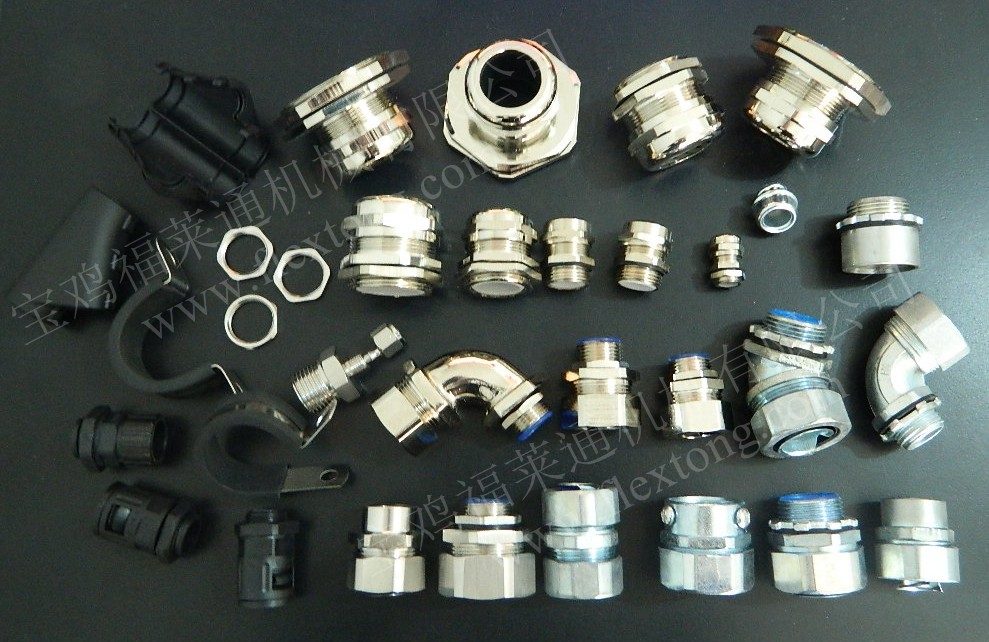 宝鸡福莱通同时生产与电缆保护套管(cable protection flexible conduit) 配套的金属&非金属软管接头,金属接头供选择的有DPJ端式包塑金属软管接头(zinc alloyed flexible conduit connectors),DPN内丝锌合金接头,DKJ螺丝钉卡套式锌合金接头,DGJ卡簧自固定拧紧式锌合金接头,FF双内丝钢管对接接头,DWJ90度锌合金弯接头,DNJ45度锌合金弯接头;DPJ可锻铸铁外丝箱接头(malleable iron flexible conduit connectors),DPN内牙可锻铸铁软管接头,DWJ90度可锻铸铁弯头,DNJ45度可锻铸铁软管接头;DPJ端式铜镀镍包塑金属软管盒接头(nickel plated brass flexible conduit connectors),DPN阴螺纹铜镀镍金属软管接头,简易两件套铜包塑金属软管接头,LTCB夹紧电缆金属软管铜接头,DWJ90度铜镀镍软管接头,DNJ45度铜镀镍软管接头;DPJ不锈钢金属软管直通接头(straight stainless steel flexible conduit fittings),DPN内丝不锈钢抛光接头,DWJ90度不锈钢软管接头,DNJ45度不锈钢软管接头;非金属软管接头供选择的有NYC尼龙快插接头,NYA90度直角波纹管接头,SVY可打开式三通接头,打开式双层波纹管接头,宝鸡福莱通可提供G螺纹,M螺纹,PG螺纹,NPT螺纹加工。