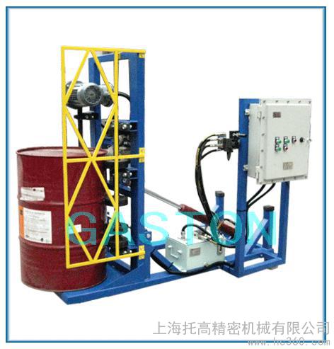 此款混合机适合200L物料桶。可借助于200L桶用搬运车,或其他设备,把物料桶搬运到机架上,I打开动力单元,通过油泵产生油压使油缸可以伸缩运动,从而轻松倒立物桶。通过手动操作阀控制。油缸的升降速度可通过调节油缸两端的单向调节阀和操作手柄下部螺丝来调节。该机采用防爆减速马达,防爆动力单元,操作安全/简单。