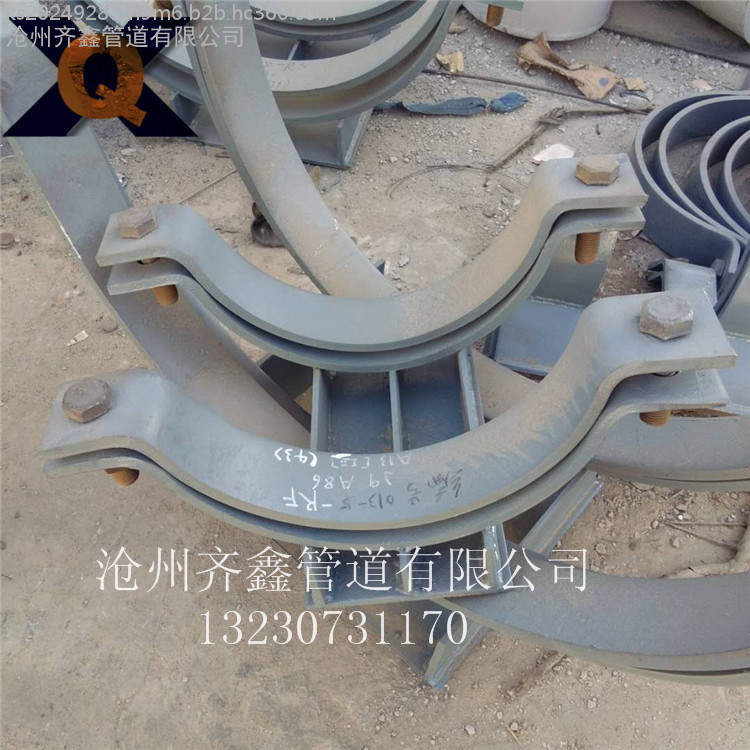 由管夹×2、支座×1,PTFE(聚四氟乙烯)板×1,滑动底板×1,以及螺栓螺母组合而成,主要工艺为弯制和焊接。管夹导向支座的主体和管夹滑动支座比较相似,管夹部分多了8块加强筋,支座部分相同,导向底板两侧焊有导向立板和加强筋,另外,聚四氟乙烯板的尺寸与管夹滑动支座不同。使用时需注意:当支座放于支墩或钢结构支架上,支座的滑动底板与根部之间如需用垫铁调整高度时,应将滑动底板垫紧找平,垫铁与根部及垫铁与滑动底板之间均应焊牢。在焊接时,应将滑动板(聚四氟乙烯板)暂时取掉,待焊完后才垫入。