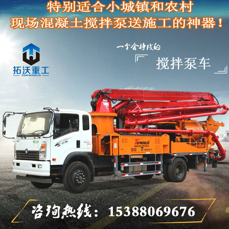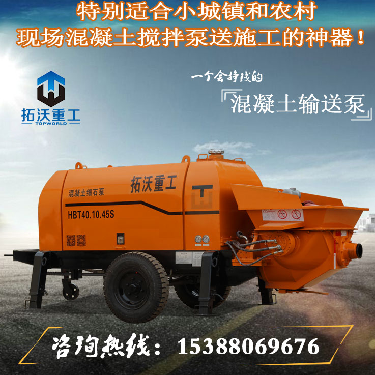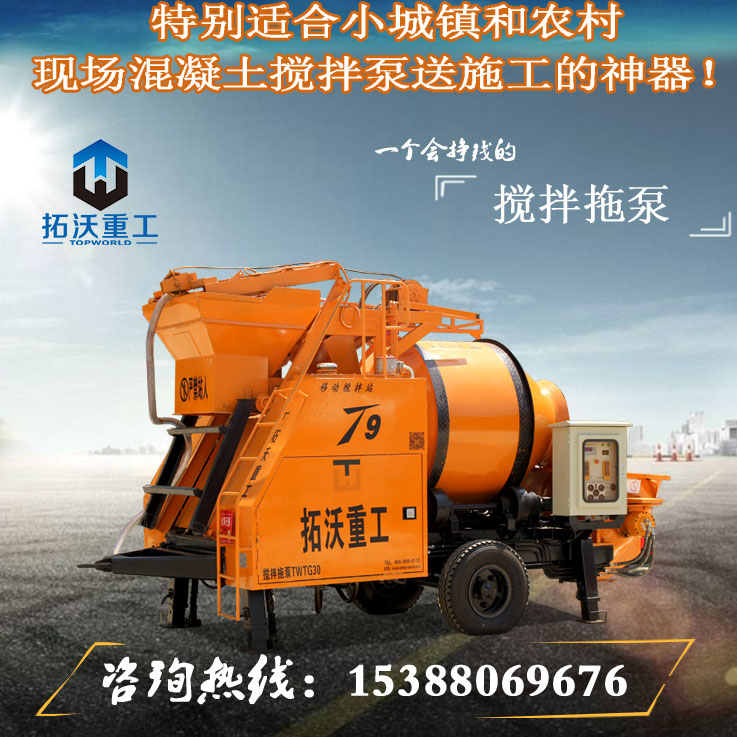 "拓沃重工混泥土搅拌拖泵机使用 5、 有表面要求的部件禁止用钢刷、清洁球等硬物擦洗表面。整车设计集经济性、可靠性、安全性耐用性于一体;1.????震动电机:拓沃自主研发的移动搅拌泵送一体机在上料斗底部和侧面均安装了震动电机,此贴心设计可以防止余料在料斗壁内的附着,让卸料更加干净,料斗和导输槽不积料。2、操作人员必须按规定进行操作、保养。如用户不按规定操作、保养机器,本公司不予保修。自有下料车间,保证材质和规格!2、动力系统老板们大家好!欢迎来我们拓沃重工参观考察。现在我们面前的这台设备是搅拌泵送一体机T*,我们这款搅拌泵送一体机具有拓沃特色和自主,是我们拓沃重工功能**全,配置**好,做工**细,技术**成熟的设备。"