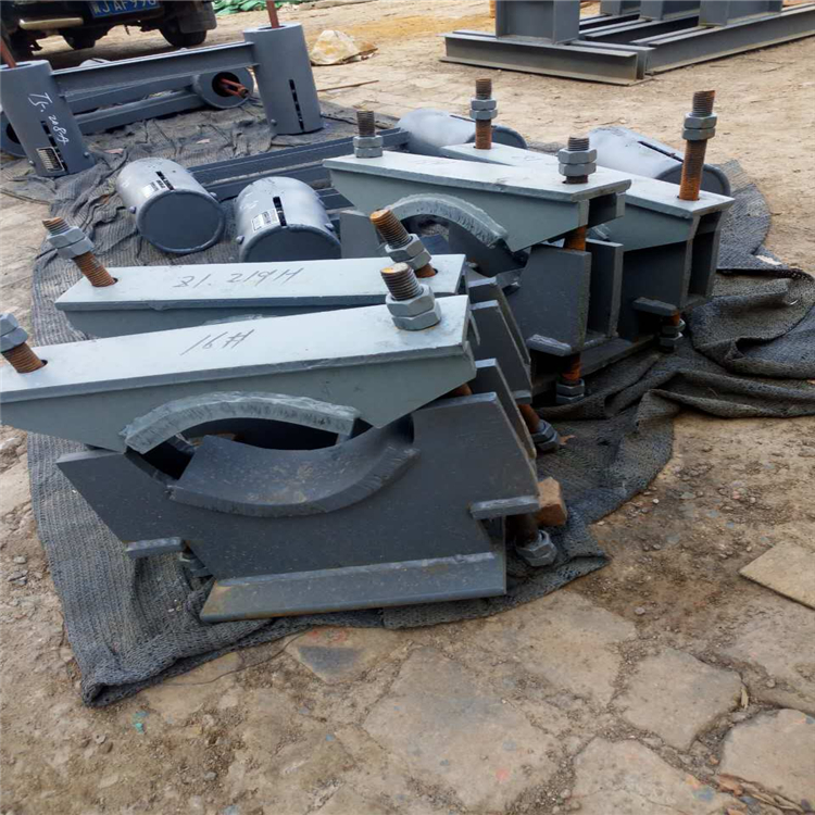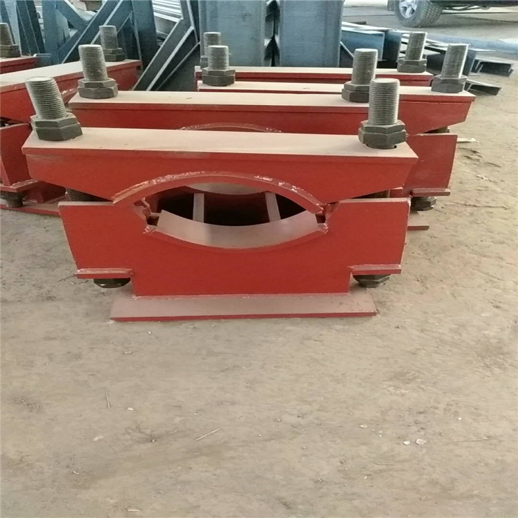 由本体(12Cr1MoV材质)×1,卡板(12Cr1MoV,焊缝按10CrMo910计算)×1,双头螺柱(25Cr2Mo1V),螺母及扁螺母(25Cr2MoVA)组合而成。管夹固定支座主要用于固定管道,承受管道压力,限制管道位移,缓冲管道振动等方面,广泛应用于电力,冶金,石油,化工等行业的管道或设备以及桥梁,建筑和大型设备等减振场合。使用时直接卡管道,两端用螺栓螺母固定。主体由合金板焊接弯制而成**可承受555°C的高温。该管座可根据需要及适用温度采用不同的材料进行制作,所以其产品标号分为H(12Cr1MoV**耐热温度555°C)、R(20#钢**耐热450°C)、S(Q235B**耐热300°C)三种。