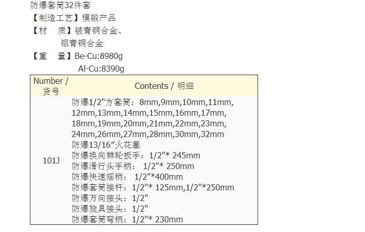 本公司生产及销售的防爆工具有360余个系列、5600多个规格。按日本标准JISM7002-96和中国标准GB10686-89检验,合格率**。该产品能有效的防止工具与工作物相互摩擦。撞击时产生的可燃性爆 炸、确保**财产和人身安全。广泛用于石油、化工、防恐怖、防磁场、煤矿、采油、采气、油气管道、发电、冶金、航空、储运、制药、制气、塑料、化纤、皮革、烟火等行业。公司生产的**钢制特种工具有60多个系列,1200多个规格。产品符合**标准GB/T4388-4395-1995。敲击类工具设计完全符合德国DIN7444、DIN133标准。
