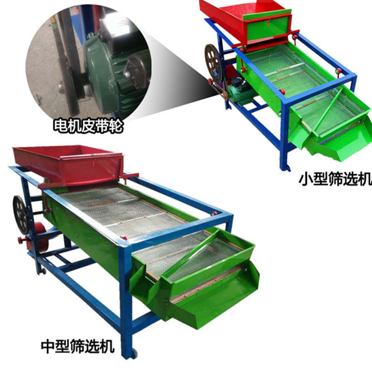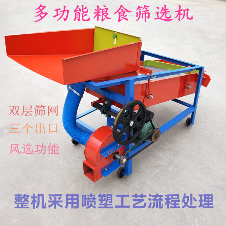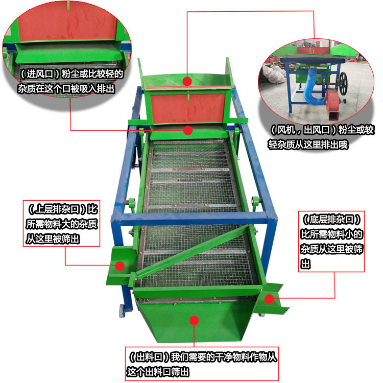 该机由料斗、机架、传动机构、风机、风道等五部分组成,机架地脚装有四个轮子,方便移动;筛网与机架采用分体式结构,便于更换各种不同目数的网筛。适用于小户型的粮食收购点,产量是每小时2-3吨,净选度98%,粮食精选机常用于小麦、水稻、玉米、大豆、棉种及各种油料种子的精选、分级和除杂。适合广大种粮收粮大户和饲料加工厂使用。