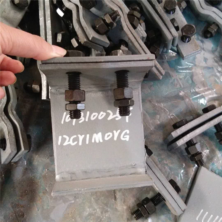 导向支座Z4管夹导向支座,由管夹×2、支座×1,PTFE(聚四氟乙烯)板×1,滑动底板×1,以及螺栓螺母组合而成,主要工艺为弯制和焊接,管夹滑动支座可根据需要及适用温度采用不同的材料进行制作,所以其产品标号分为H(12Cr1MoV,较高耐热温度555°C)、R(20#钢,耐热450°C)、S(Q235B,耐热300°C)三种。
