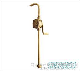 防爆手摇油泵产品简介:用于在易燃易爆场合抽送汽油、机油、柴油、煤油、食油等各种油类。本品具有体轻,吸抽油容易,安装操作方便,耐用等特点,防爆材质制造,不会引起火花,在易燃易爆场所.使用安全。精铸产品。产品材质:铍青铜合金、铝青铜合金