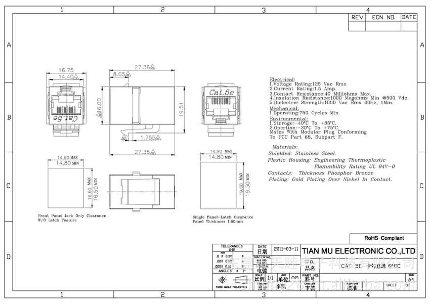 | 接触件材质 | 磷青铜镀金 |