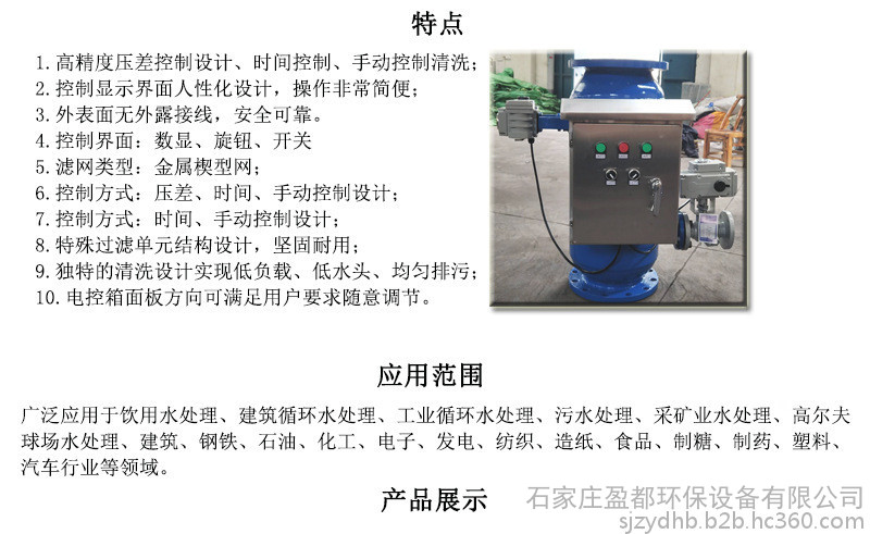 自动反冲洗排污过滤器宜安装在直角弯管上,自动反冲洗排污过滤器宜水平或垂直安装,直通式当垂直安装时,水流方向应该是自上而下,安装时应注意外客上箭头方向必须与水流方向一致。反冲洗过滤器正常工作时,水流导向阀开启。水在通过过滤型电式水处理器时在水流导向阀的作用下,由进水口进入设备内部,在特殊结构的过滤单元中各种杂质和悬浮物被截留在设备内部清水从出水口流出。当过滤型电式水处理器需要排污时,水流导向阀关闭,水经过过滤单元的前半段过滤段,部分水由出水口流入系统,剩余的水由过滤单元的后半段流入内侧,经排污口流出,起到自动冲洗过滤单元的作用。整个过程水系统可正常运转,无需停机。sldss