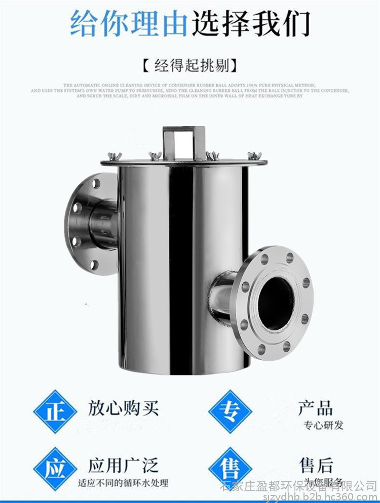 设备内部有不锈钢滤网,原水通过不锈钢滤网过滤,将杂物拦截在滤网内部,净水从出水口流出。过滤器底部设有排污口,可以将泥沙,毛发,纤维等杂物排出。过滤网从内部取出进行清洗。