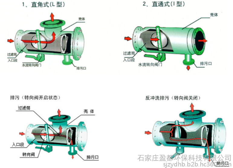 3、反冲洗排污 反冲洗时,水流转向阀为关闭状态,排污阀开启,这时水流被迫从过滤网筒的入口段网孔进入过滤筒外侧与壳体夹层,反向从网筒外侧冲洗粘附在网孔上的杂质,达到清洁过滤网的目的。由于转向阀关闭,水经过反冲阀后流速增大,反洗效果好。