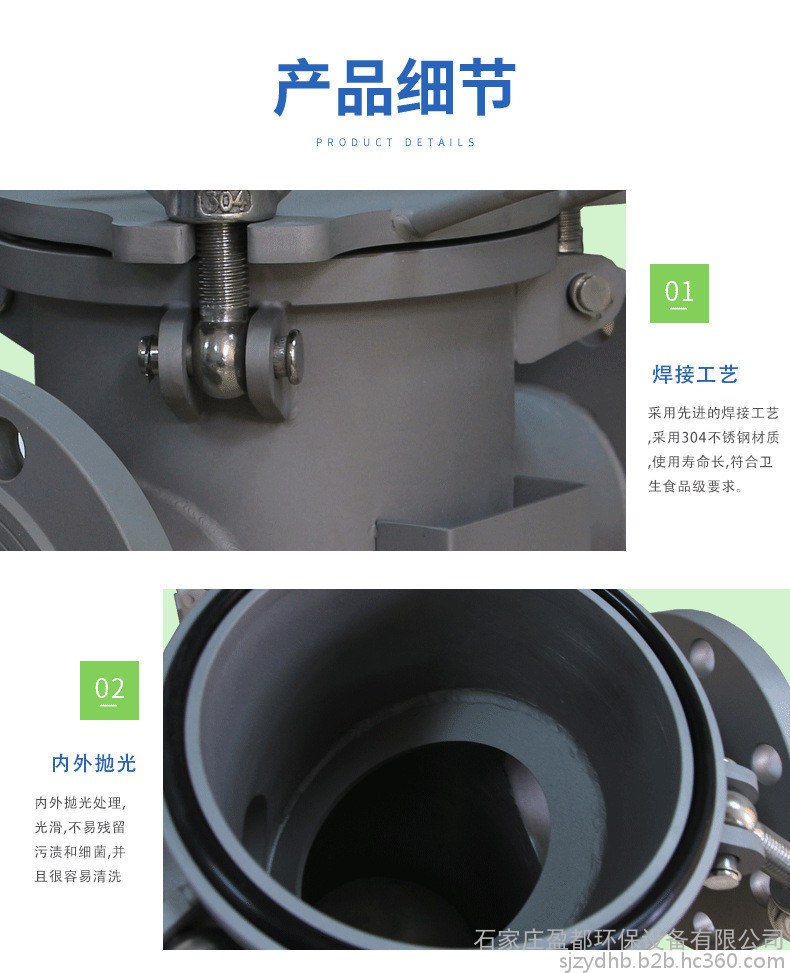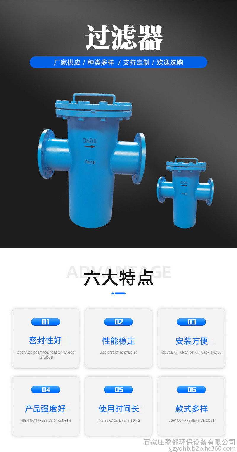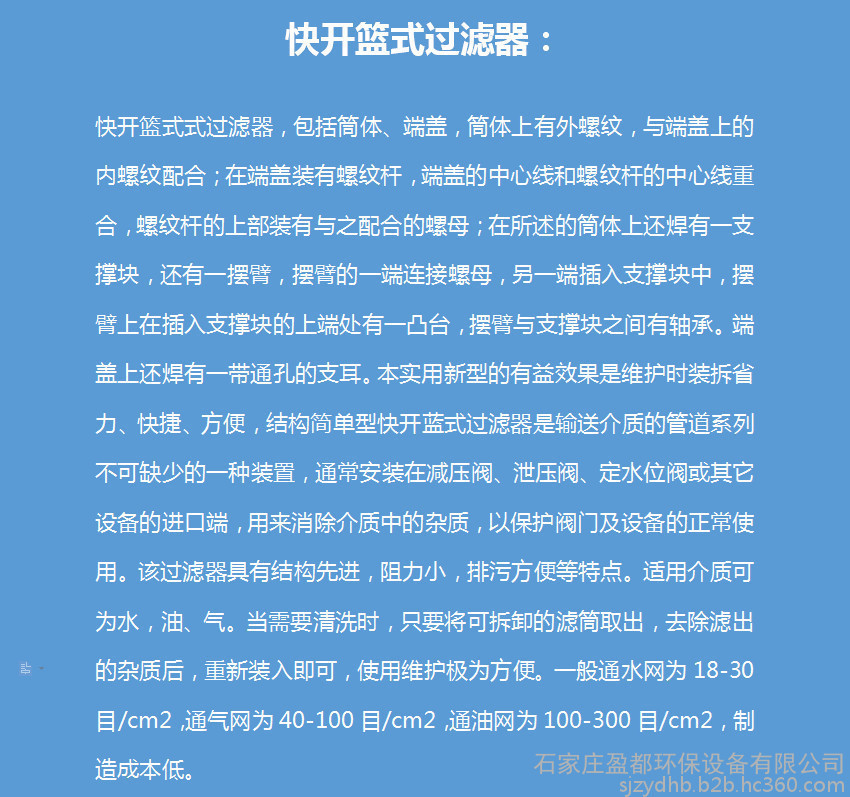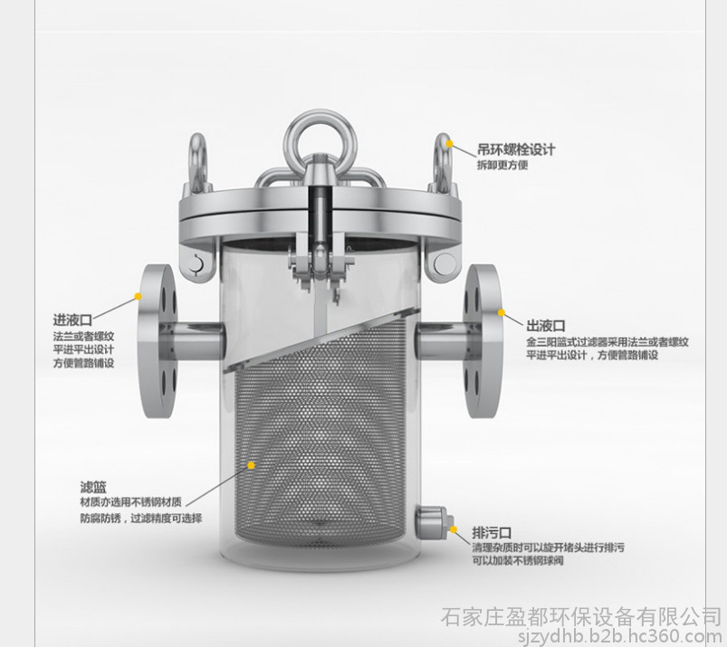 适用范围 在各种规模的游泳池中,配合普通清水离心泵使用。或者用于油或其它液体管道上,主要用于管道上,用来过率管道里的杂物。过滤孔面积比通径管面积大2-3倍.远远超过Y型、T型过滤器过滤面积。过滤器精度在过滤器中属于一种精度佳的过滤器,滤网结构与其它过滤网不一样,主要由接管、主管、滤篮、法兰盖及紧固件等组成,当流体通过主管进入滤篮后,固体杂质颗粒被阻挡在滤篮内,而洁净的流体通过滤篮由过滤器出口排出。当需要清洗时,旋开主管底部螺塞,排净流体,拆卸法兰盖,取出滤篮。清洗后重新装入即可,因此,使用维护极为方便。