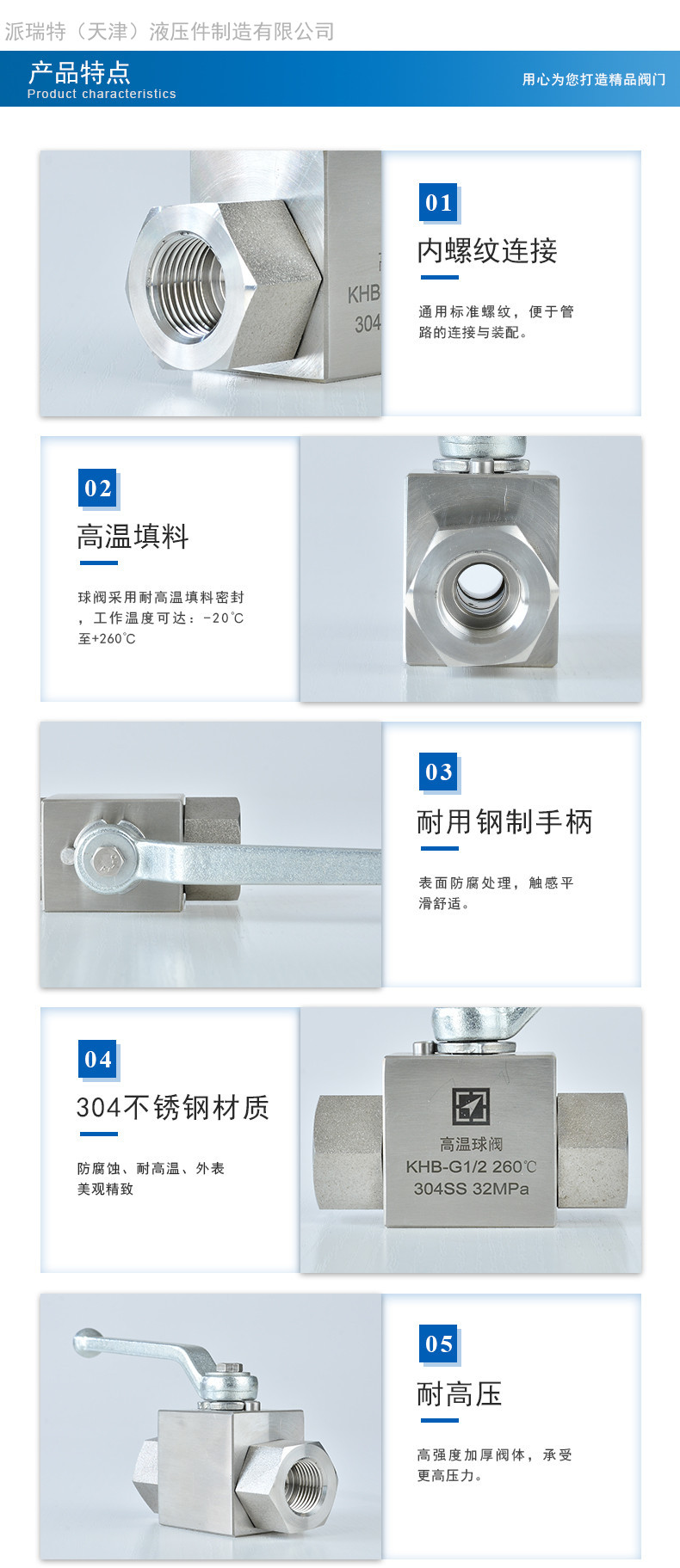 高温球阀的主要特点是本身结构紧凑,密封可靠,结构简单,维修方便,密封面与球面常在闭合状态,不易被介质冲蚀,易于操作和维修,适用于水、溶剂、酸等一般工作介质,而且还适用于工作条件恶劣的介质,如氧气、过氧化氢、甲烷和乙烯等,在各行业得到广泛的应用。球阀阀体可以是整体的,也可以是组合式的。