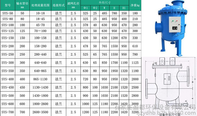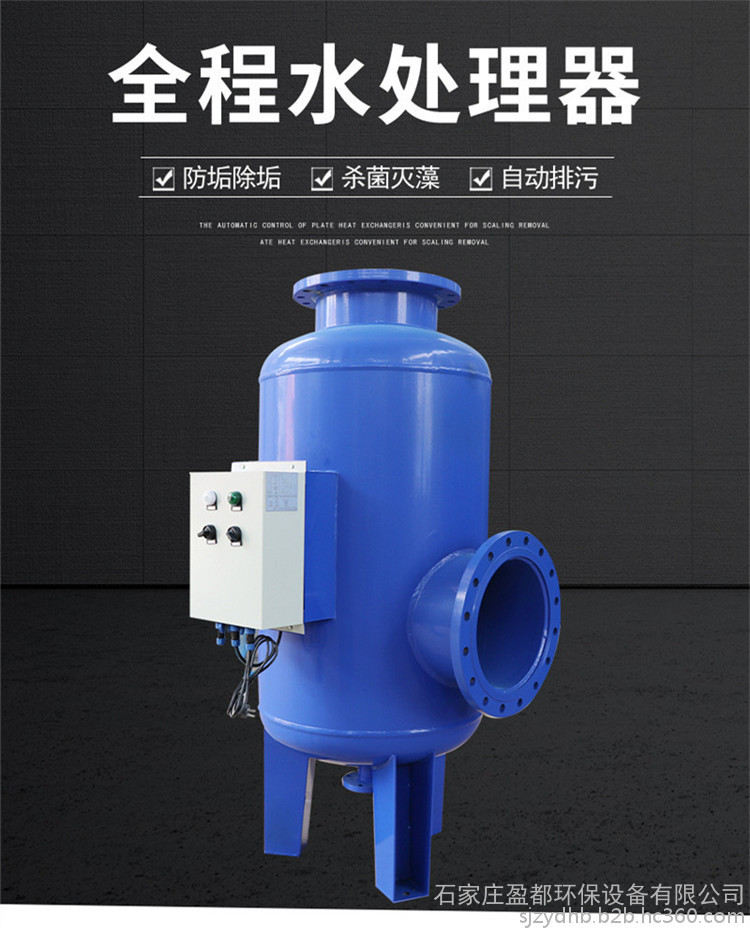 全程综合水处理器主要由**碳钢筒体,特殊结构的不锈钢网、高频电磁场发生器、电晕场发生器及排污装置等组成。通过活性铁质滤膜,机械变径孔阻挡及电晕效应场高频电磁场四位一体的综合过滤体,吸附在实际运行工况下各种水系统已形成的硬度物质及复合垢,降其浓度,达到控制污垢及大部分硬度垢的目的。并通过换能器将特定频能量转换给被处理的介质水,形成电磁极化水,使其成垢离子的排列顺序位置发生扭曲变形,当水温升高到一定程度时,处理后的水需经过较长一段时间方能恢复到原来的状态。在此阶段,成垢的机率底,同时设备内壁金属离子受到抑制,对无垢系统具有防腐蚀作用。此外电磁场化水还可有效地杀灭水中的菌类、藻类等,有效地抑制水中微生物的繁殖。所以,全程综合水处理器在系统正常运行状态下,可以完成防腐、除垢、菌灭藻、超净过滤、控制水质的综合功能。