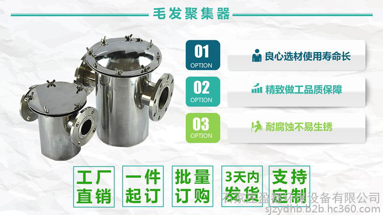 产品选用要点 1)、应优先选用成品毛发过滤器。 ?? 2)、毛发过滤器的壳体应选用耐腐蚀材料,如塑料、玻璃钢、不锈钢或铜等,如选用铸铁或碳钢材质应进行防腐处理,内衬防腐材料必须符合卫生要求。壳体工作压力不宜小于0.35MPa。 ?? 3)、毛发过滤网的材质也应选用耐腐蚀材料。