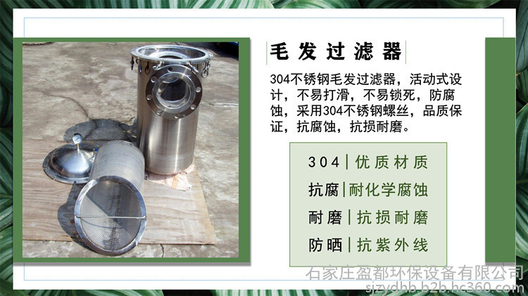 施工、安装要点 1)、应设在循环水泵的吸水管上,必须严格按照毛发过滤器的水流方向安装,不得逆向安装。 ? 2)、毛发过滤器必须安装在基础或地面上,不得依靠管道承担其重量。 ??
