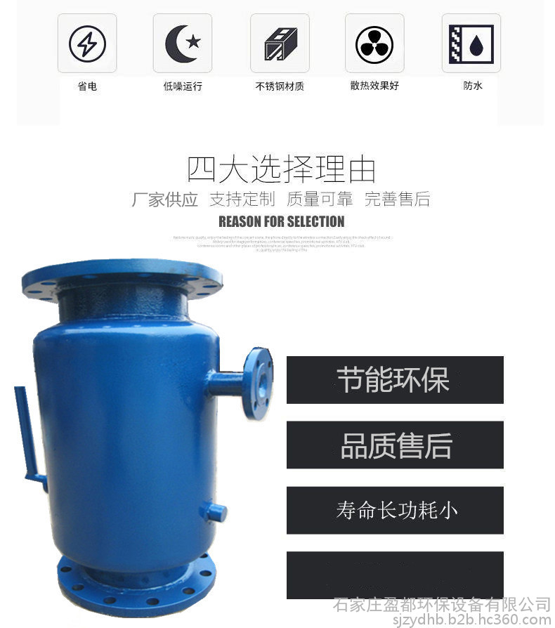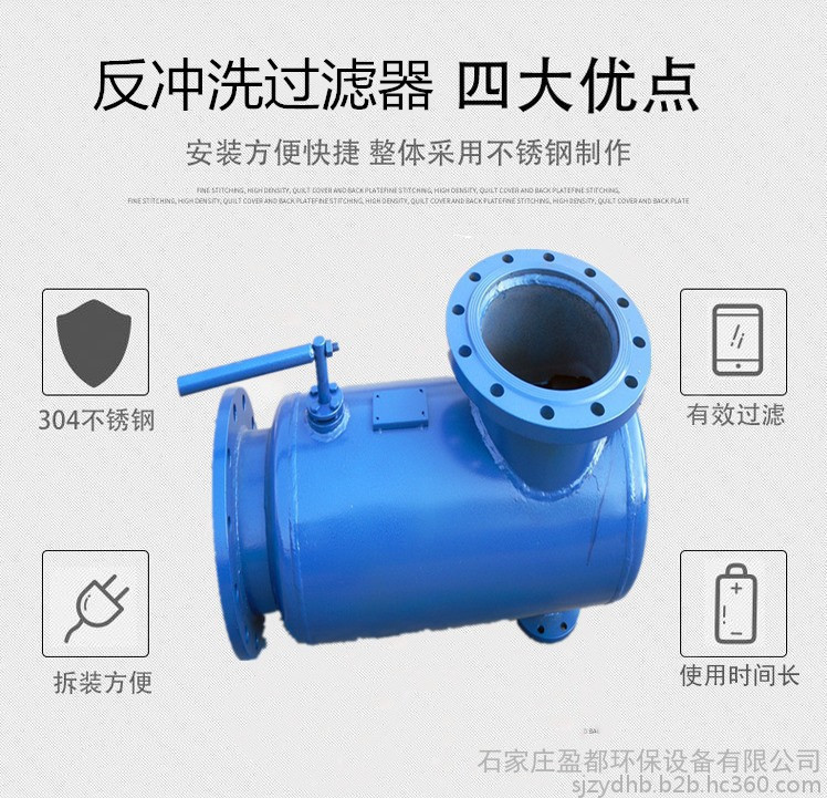 自动反冲洗排污过滤器宜安装在直角弯管上,自动反冲洗排污过滤器宜水平或垂直安装,直通式当垂直安装时,水流方向应该是自上而下,安装时应注意外客上箭头方向必须与水流方向一致。反冲洗过滤器正常工作时,水流导向阀开启。水在通过过滤型电式水处理器时在水流导向阀的作用下,由进水口进入设备内部,在特殊结构的过滤单元中各种杂质和悬浮物被截留在设备内部清水从出水口流出。当过滤型电式水处理器需要排污时,水流导向阀关闭,水经过过滤单元的前半段过滤段,部分水由出水口流入系统,剩余的水由过滤单元的后半段流入内侧,经排污口流出,起到自动冲洗过滤单元的作用。整个过程水系统可正常运转,无需停机。
