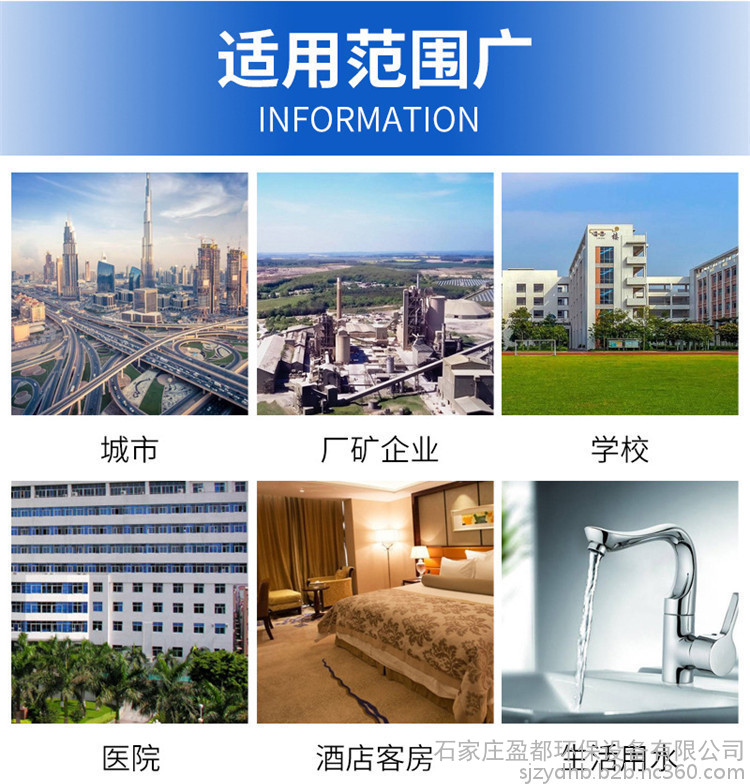 空调系统循环水处理、工业设备循环冷却水处理、小区集中供热水处理、游泳池循环水处理、宾馆、洗浴热水处理、工业废水处理。