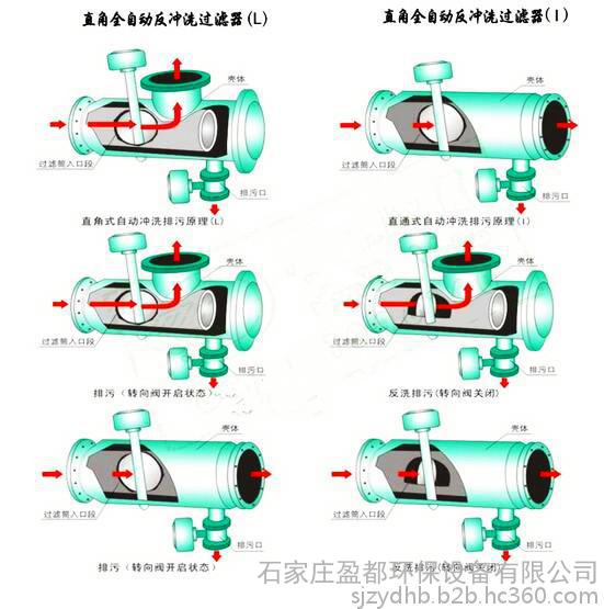 自动排污过滤器主要由碳钢筒体、特殊结构的不锈钢楔形滤网、水流导向阀及排污装置所组成。当过滤器工作时,水流导向阀处于开启状态,水流由入口进入过滤器,经过滤网过滤到出口。当过滤器需要排污时,关闭水流导向阀,打开排污阀,水流经滤网前半段过滤,部分水流由出口流入系统,剩余水流由滤网后半段外侧流入内侧,经排污口排出,起到反向自动冲洗滤网的作用。这样整个冲洗过程系统可正常运行,无需停机。