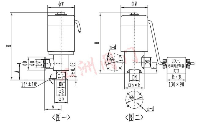 (图二)连接及外形尺寸 型号 通径(DN) ΦW ΦB H h bxb n-b 法兰标准 GDC-J16A 16 68 42 165 28 48x48 4-M5 JB919 GDC-J25A 25 82 55 190 35 58x58 4-M6 GDC-J32 32 92 64 217 40 68x68 4-M6 GDC-J40 40 110 70 240 44 80