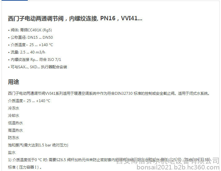 当--次管道内的热媒介质流过西门子温控阀,把换热器内的介质加热升温。随著被加热介质的温度变化通过温度传感器,将温度信号送至温度控制器,温度控制器的当前温度与设定温度比较运算后将4-20ma或0-10V信号送给执行器调节温控阀的开麼,使一 -次热媒介质流量发生变化。温度的细微变化将使传感器作出响应,改变热媒介质流量,控制被加热介质的温度。也可以在换热器中使用,用蒸汽或热水可作为加温型使用,用冷水可用于冷却型使用。