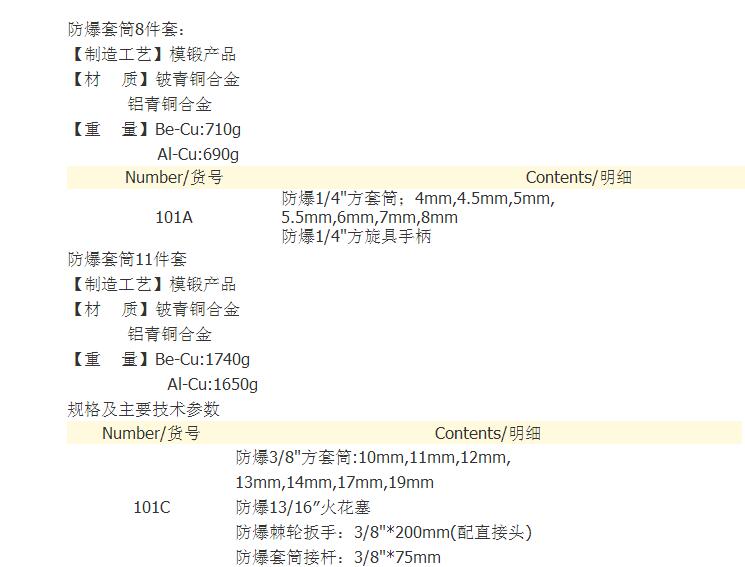 本公司供应防爆方32件套盒装套筒101j 骏防 其中包括8、9、10、11、12、13、14、15、16、17、18、19、20、21、22、23、24、26、27、28、30、32mm 的防爆1/2‘’方套筒和防爆1/2''*245mm换向棘轮扳手和防爆1/2‘’*250mm滑行头手柄 防爆13/16’‘火花塞 防爆快速摇柄1/2‘’*400mm 防爆套筒接杆1/2‘’*125mm,1/2‘’*250mm 防爆套筒弯柄1/2‘’*230mm 防爆万向接头1/2‘’ 防爆旋具接头1/2‘’ 材质 铍青铜合金、铝青铜合金 重量be-cu 8980g al-cu 8390g 使用范围 在易燃易爆场所,用于位置特殊、空间狭窄、深凹、活扳手和呆扳手不嫩使用的空间;用于紧固或拆卸六角螺栓、螺母,质量保证,欢迎咨询洽谈。