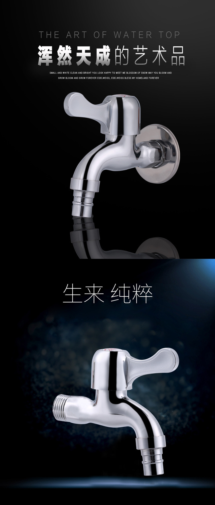 此款龙头材质为锌合金,单独课题重量75克左右。整体重量为165克,加厚加重合金壳体,塑料款式把手,不锈钢洗衣机嘴巴。龙头都配有装饰盖。