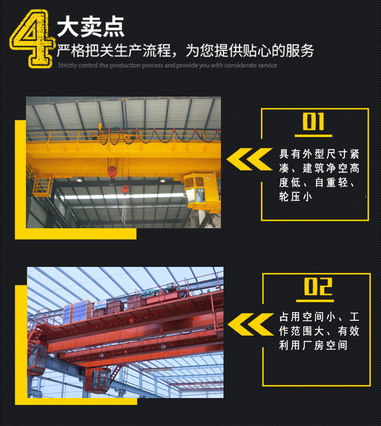 | 双梁桥式起重机操作室分开式、闭式、保温三种。双梁桥式起重机操纵室平台入口分侧面、端面、顶面三种。H为大车缓冲器增加的高度。双梁桥式起重机分室内、室外两种。订货时应注明工作环境、气温及电源种类等技术要求。增加了超载限制器、大屏幕显示器及各种保护装置,进一步增加了使用过程中的安全性。 |