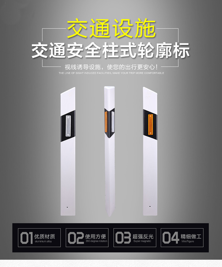 用途:在夜晚或光线昏暗的条件下,指示车行道的边界、道路的走向和某些容易发生危险路段的位置和长度,提示驾驶车辆的人员按规定的道路行驶,防止驶出路外边缘发生意外。柱式轮廓标夜间反射光均匀,不眩目,广泛应用于高速公路、隧道、桥梁、迂回的道路等路边标志。