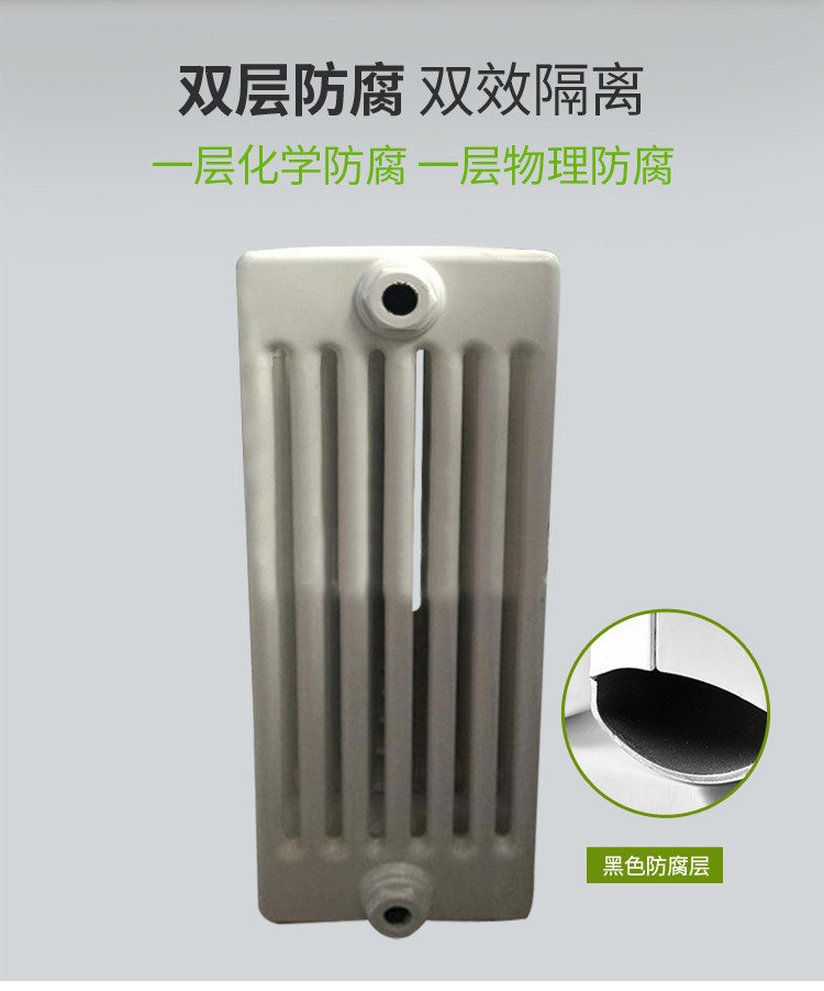 钢制柱型暖气片使用锌系磷化液处理后的工件正常存放条件下30天不会返锈。 经处理后的散热器内腔防腐层与钢材表面有非常好的附着力,益友散热器采用散热器专用防腐涂料2次灌装烘干,使得内防腐涂层能全面、均匀地覆盖整个散热器内腔。有效解决了钢制散热器的耐腐蚀问题。