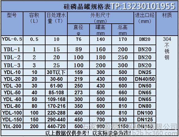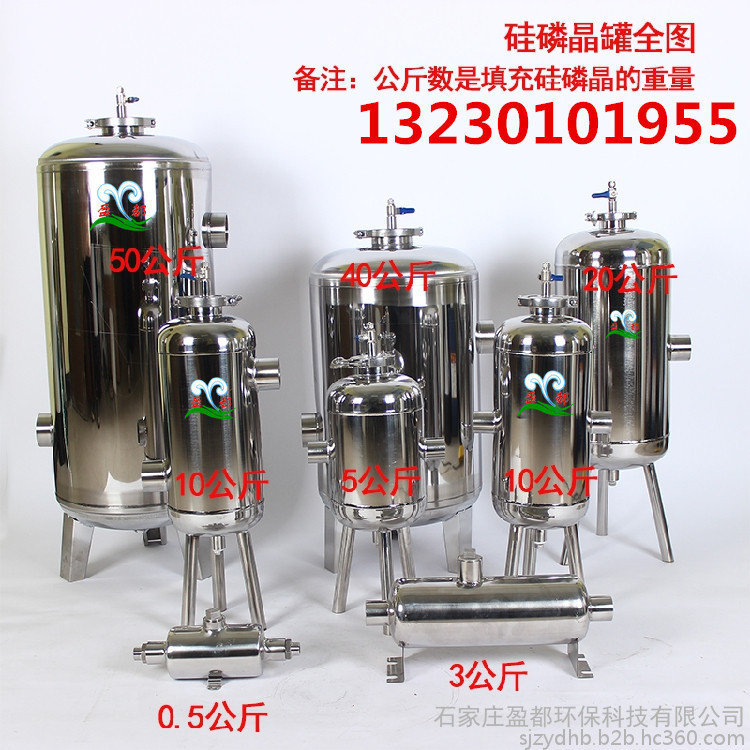 本公司(石家庄盈都环保设备有限公司)硅磷晶罐均采用豪华食品级304不锈钢材打造,豪华卫生安全耐用,设计独特实用,各种规格型号齐全。可定制。安装使用方便,零故障率。硅磷晶罐的材质一般选择与所连接的工艺管道材质相同,对于不同的服役条件可考虑选择塑料、玻璃钢,碳钢、低合金钢或不锈钢材质的过滤器。