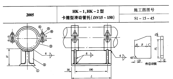 卡箍型管道管托标注方法:如选用HK-1型管托,DN200标注为HK-1-200.