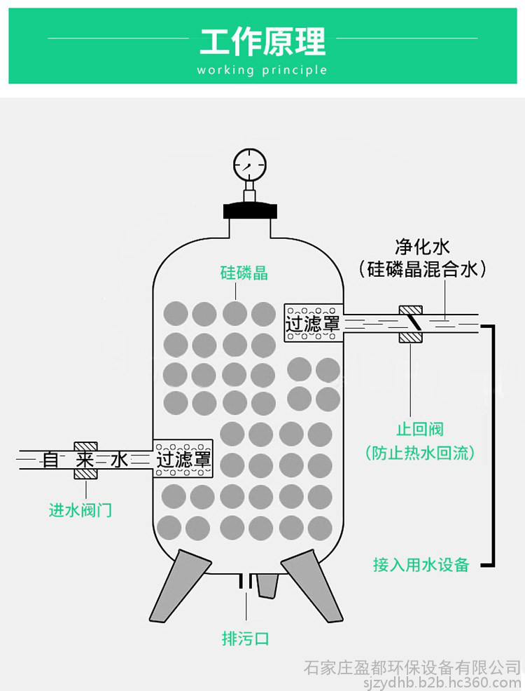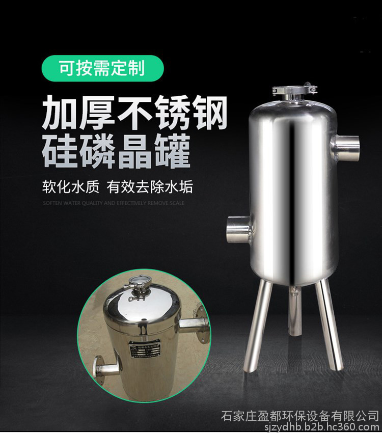 过滤式硅磷晶罐广泛应用于暖通工程、化工、印染、造纸等各种行业的供用水管道上,罐内硅磷晶通过水流冲击产生布朗运动,此时药剂缓溶于水中**可正常发挥它的药理作用。