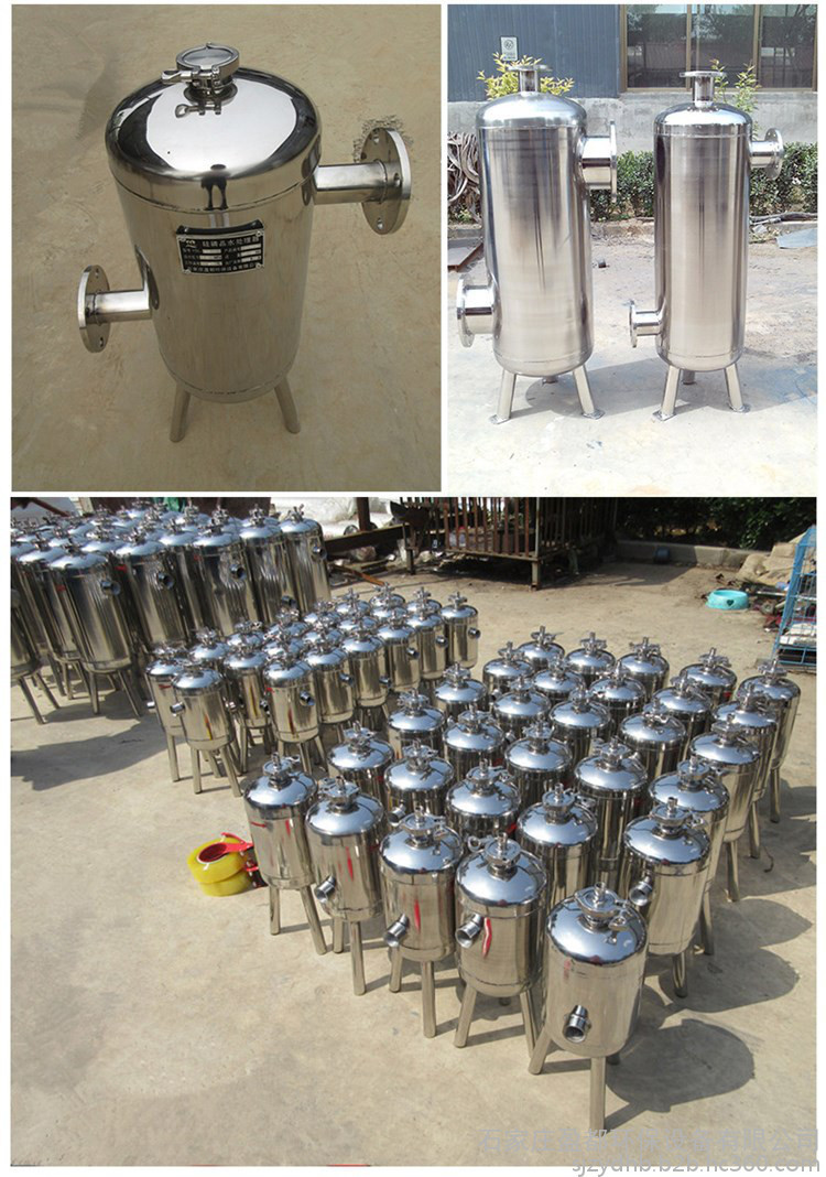 硅磷晶罐是硅磷晶水处理中不可缺少的一种装置,通常安装在减压阀、泄压阀、定水位阀或其它设备的进口端,用来拦截加药罐中的硅磷晶球,以保护阀门及设备的正常使用。当流体进入置有一定规格滤网的滤筒后,其球体被阻挡,而清洁的滤液则由硅磷晶罐出口排出,当需要清洗时,只要将硅磷晶取出,处理后重新装入即可,因此,使用维护极为方便。