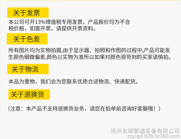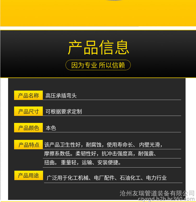 与管子连接的方式有:直接焊接(常用的方式)法兰连接、热熔连接、电熔连接、螺纹连接及承插式连接等。按照生产工艺可分为:焊接弯头、冲压弯头、推制弯头、铸造弯头、对焊弯头等。其他名称:90度弯头、直角弯等