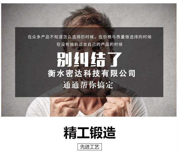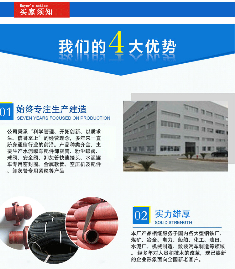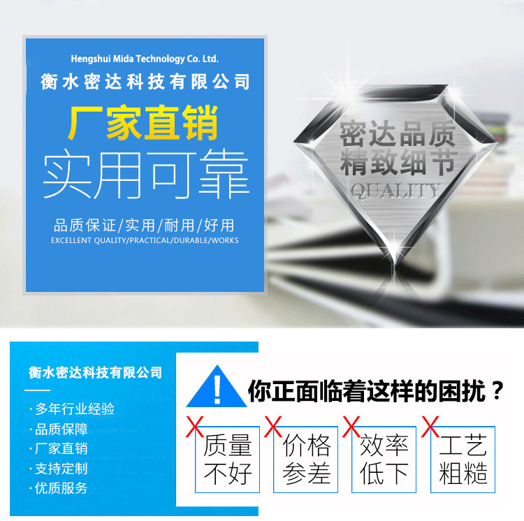 衡水密达科技有限公司是一家中型橡塑制品企业,本厂位于河北省景县将河流镇工业园区,京沪高速20公里,京九铁路20公里;铁、公路交通运输都非常便利。本厂始建于1980年,是以生产销售水泥罐车配件卸灰管、水泥罐车配件阀门、水泥罐车配件接头、水泥罐车配件密封圈、金属软管、空压机及配件、抱箍系列等为主的企业。本厂产品相继服务于国内各大型钢铁厂、煤矿、冶金、电力、船舶、化工、油田、水泥厂、机械制造、散装汽车制造等领域。 经多年对人员和技术的改革,现已崭新的企业形象面向全国新老客户。??公司是依科研和开发为主的橡胶制品生产实体,技术力量雄厚,生产设备先进,拥有国内先进的、压延成型机、硫化机等成套生产设备;检测手段齐全,有独立的实验室,各环节基本上实现了自动化流水线生产,公司利用ISO9002质量管理体系,制定了一整套科学的、严格的、实用的企业内控标准管理和监督产品质量。以我公司技术人员开发出来的输送带、提升带、胶件以及橡塑制品的各项指标均达到GB7984—87、新标准GB7984—2001,产品畅销全国三十多个省、市。并获得了重合同首信用、执行政策先进单位等荣誉称号。