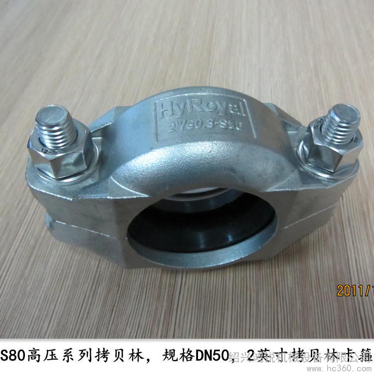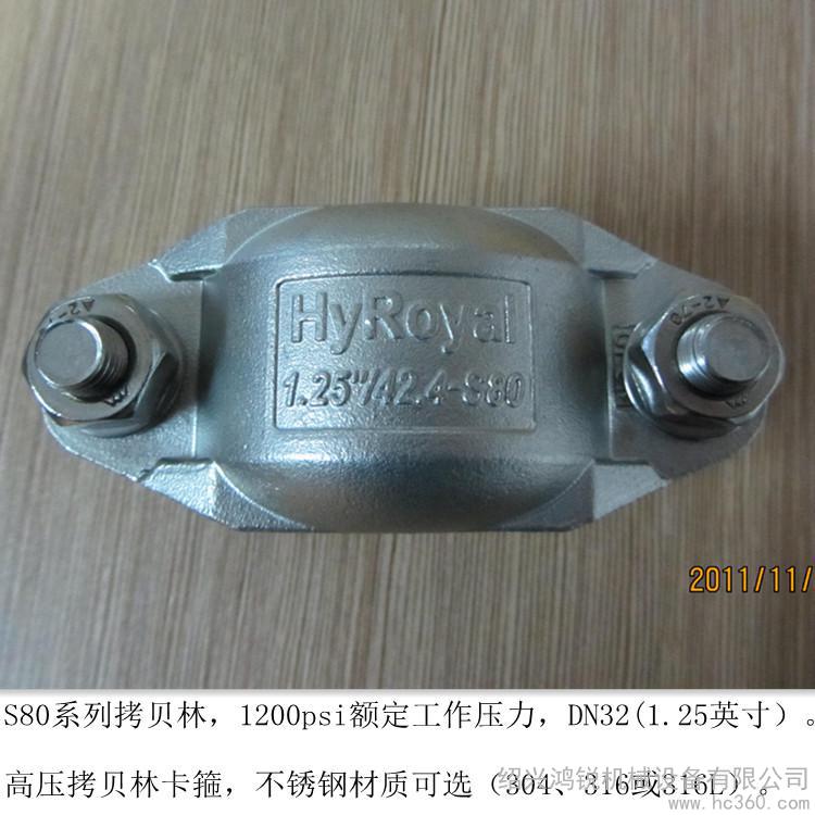 本公司供应卡箍,品牌HyRoyal,型号S80。参数为:规格:DN20至DN80,材质:不锈钢304、316、316L,表面处理:喷丸酸洗,类型:不锈钢沟槽式挠性卡箍,适用范围:海水淡化设备专用高压卡箍。质量保证,欢迎咨询洽谈。