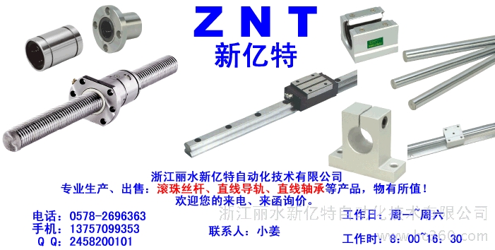 浙江丽水新亿特自动化技术有限公司专卖自产多型号滚珠丝杆、直线滚轮导轨、直线滚珠导轨、直线导轨、光轴、直线轴承、关节轴承、滑块、光轴支撑等系列产品,如需其它产品请咨询。联系人:小姜,QQ:2458200101,手机:13757099353,电话:0578-2696363(此产品图片、型号、价格仅供参考,具体产品型号、价格等请联系询问,谢谢!)。