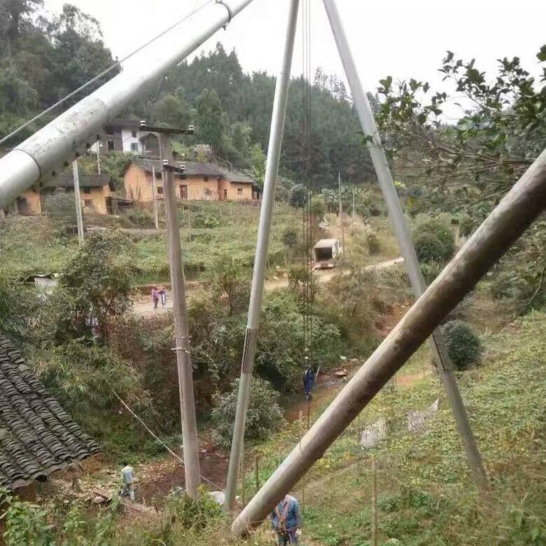 4、三角架立起后应保证三杆头部连接处与线杆坑底部垂直。