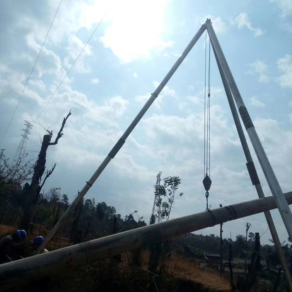 铝合金三脚架立杆机用于输配电线路施工中整体起立小型单杆或起吊一般重量的部件。说明:手摇绞磨输出力为5kN;立杆机安全系数2.5