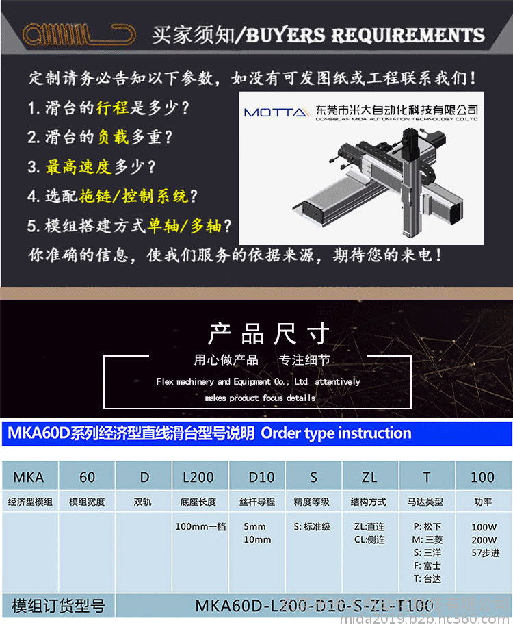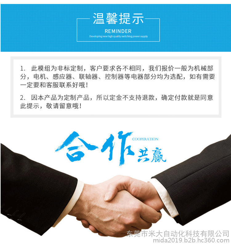 各位顾客,感谢您光临本店。在此郑重声明,本公司的所有模组和滑台均属于自主研发生产,所有配件质量有保证,货期可商量。现本店标识的价格均为虚价,产品参数提供的都是标准件,也可定制非标产品。如有需要,请联系我们的客服,愿真诚与您合作,互利双赢。